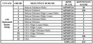 Başkanlığımız taşra teşkilatındaki sözleşmeli imam-hatip pozisyonlarına; 2016 yılı KPSS puan sırası esas alınarak her bir grup için tabloda belirtilen boş kadro sayısının üç (3) katına kadar çağrılacak adaylar arasından sözlü sınav sonucu başarı sırasına göre 4-B sözleşmeli imam-hatip alınacaktır.