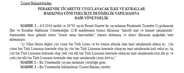Perakende Ticarette Uygulanacak İlke ve Kurallar Hakkında Yönetmeliğin 12/B maddesinin birinci fıkrasına “taksitli mal ve hizmet satışlarında” ibaresinden önce gelmek üzere “konut satışı haricindeki” ibaresi eklenmiş ve ikinci fıkrasına aşağıda belirtilen bent eklendi.