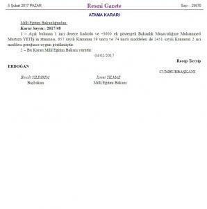 Resmi Gazete’de yayımlanan karara göre Milli Eğitim Bakanlığı Müşavirliğine Murtaza Yetiş’in atanması kararının alındığı ifade edildi. Atama kararlarının detayları şu şekilde;