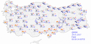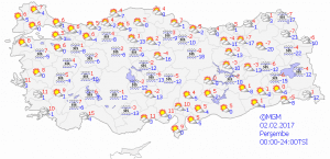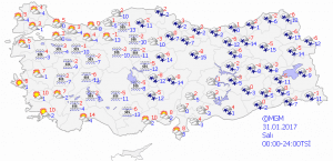 Son değerlendirmelere göre; Ülkemizin kuzey, iç ve doğu kesimleri ile zamanla güneybatı kesimlerinin çok bulutlu, Orta Karadeniz kıyıları, Doğu Karadeniz, Doğu Anadolu’nun güneydoğusu, Sivas, Bartın, Sinop ve Ardahan çevreleri ile Kastamonu’nun kıyı kesimlerinin aralıklı kar yağışlı, sabah saatlerinde İstanbul’un kuzey kesimlerinin hafif yağmurlu, gece saatlerinde Muğla çevrelerinin karla karışık yağmurlu, diğer yerlerin parçalı ve az bulutlu geçeceği tahmin ediliyor. Kar yağışının; Rize ve Artvin çevrelerinde yer yer yoğun olması bekleniyor. Kuzey, iç ve doğu kesimlerde yer yer kuvvetli olmak üzere buzlanma ve don olayı, iç ve doğu kesimlerde yer yer pus ve sis görüleceği tahmin ediliyor.