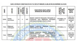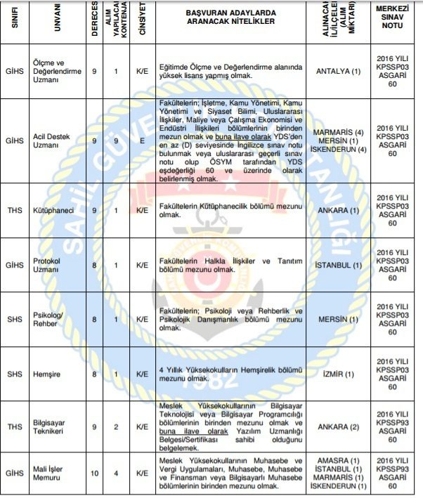 Sahil Güvenlik Komutanlığı Karargâhı ile bağlısı birlik ve kurumlarda istihdam edilmek üzere “Jandarma Genel Komutanlığı ve Sahil Güvenlik Komutanlığında İlk Defa Devlet Memurluğuna Atanacaklar İçin Yapılacak Sınavlar Hakkında Yönetmelik” hükümleri doğrultusunda 657 sayılı Devlet Memurları Kanunu’na tabi olarak aşağıda durumları açıklanan unvanlardan açıktan atama yoluyla devlet memuru alımı yapılacaktır.